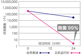 在试验箱(约9升空间)的密闭空间内,加入产品主体和试验菌液(培养皿(φ6mm)2mL),在产品运转的同时在室温下保存。24小时后,使用SCDLP培养基10mL洗脱后,使用菌数测量用培养基测量洗脱液中的活菌数,换算成每一试样的相当量。