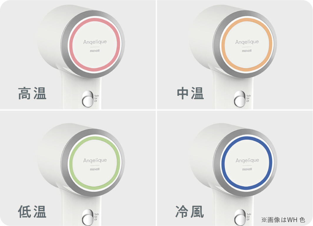 モード切替で、高温(赤)、中温(オレンジ)、低温(緑)、冷風(青)が選べます。